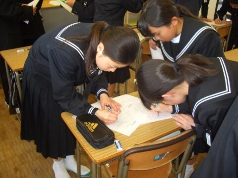 『人間コピー』と題し、目で見た図を言葉で伝え、相手に同じような図を描いてもらう活動に取り組みました。やり始めは線の角度や長さ、曲線の曲がり具合など伝える方も描く方も苦労していました。慣れてくると似たような図が出来上がっていきました。相手に伝えることの難しさを体験しました。