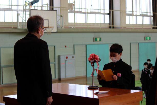 次に、新入生代表が誓いの言葉を述べました。「入学できたことをうれしく思い、先生方や先輩の教えをよく守り、校訓を心に刻み立派な赤羽根中学校の生徒になることを誓います。」と力強い言葉で言いました。