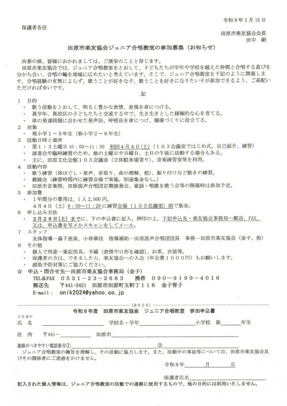| タイトル | 田原市楽友協会ジュニア合唱教室の参加募集 2/28〆切 |