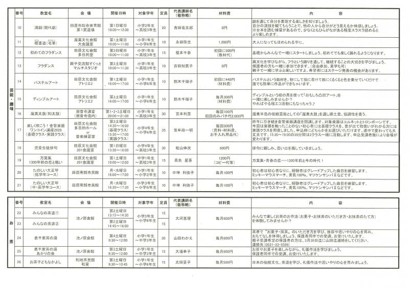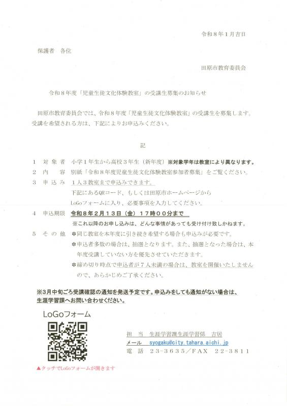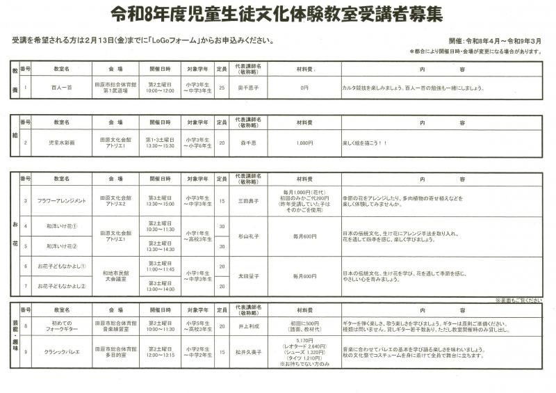 | タイトル | R8「児童生徒文化体験教室」の受講生募集のお知らせ 2/13〆切 |