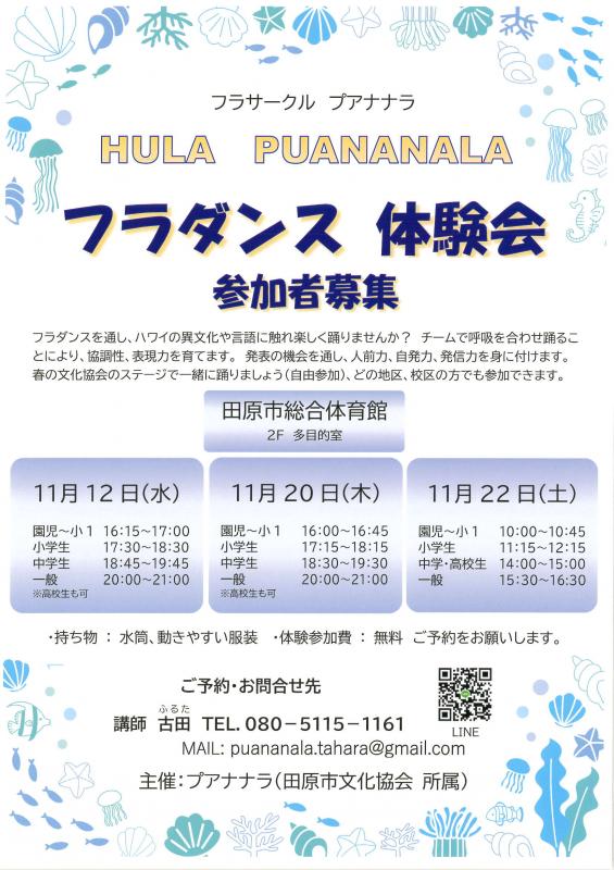 | タイトル | 11.12、20、22 フラダンス体験会 |