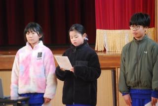 5年生が、総合で防災について学習したことを、朝会で発表しました。