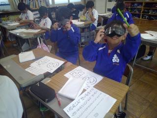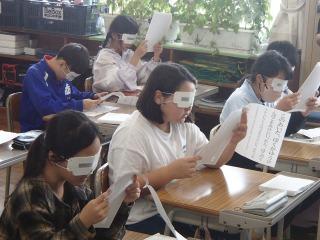 見えにくくなるようなアイマスクをつけて、文を読んだり、迷路をしたりしました。