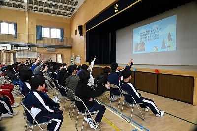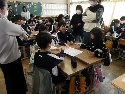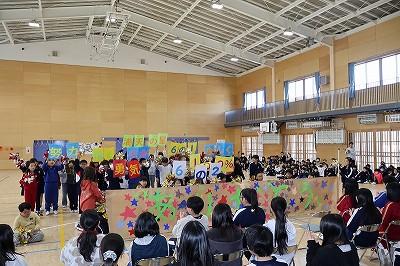 「ありがとう集会」が行われ、各学年の出し物のほか、5年生が作った思い出クイズや思い出のアルバムで盛り上がりました。最後は在校生全員で「ハイタッチ」という歌を歌い、6年生に感謝の気持ちを伝えました。作曲した斎藤佑磨先生も来校され、在校生300人の歌声に感動していました。6年生から在校生にはお礼として「ミニどうほザウルス」「ペン立て」のほか、手紙と歌のプレゼントがあり、互いに「ありがとう」の気持ちを伝える素敵な会になりました。6年生が登校するのもあと9日です。