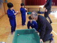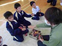 子どもたちは「おはじきをやさしくはじくことができました。おはじきめいじんになりました。」「おてだまのこつがわかりました。ちょっと上にとばすとうまくできました。」「こまのひもをしっかりまくとよくまわるよとおしえてもらいました。」など、昔遊びのこつを知り、名人や達人を目指して楽しみました。