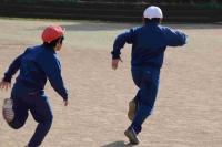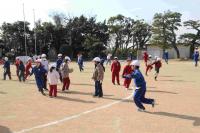 赤帽子を被った警察役の子どもたちが、白帽子を被ったどろぼうを追いかけ、捕まえます。先生たちも警察役になって、運動場を走り回りました。