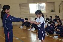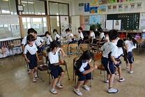 6年生が3年生の脈を測ります。脈が速くなりすぎないよう、心地よい運動ができたかな?