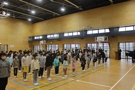 5月24日(水)、陸上大会の選手壮行会がありました。陸上大会に出場する5、6年生に向けて、みんなでエールを送りました。