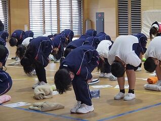 ボールの代わりに玉入れの玉を使って、床に落とさないようにパスしていました。バレーボールでボールを落とさずつなぐ練習になります。