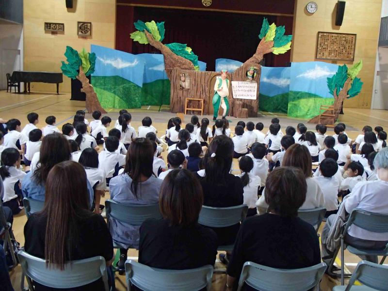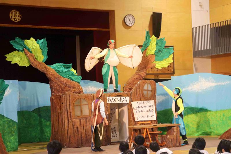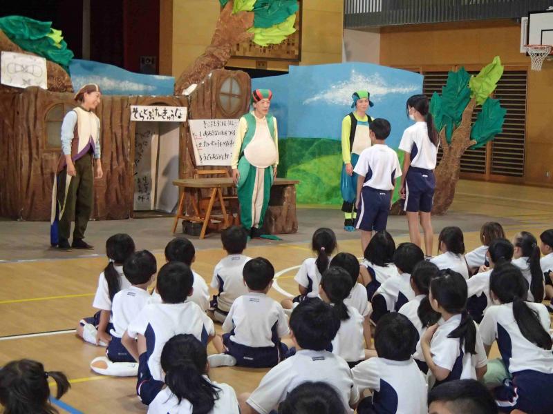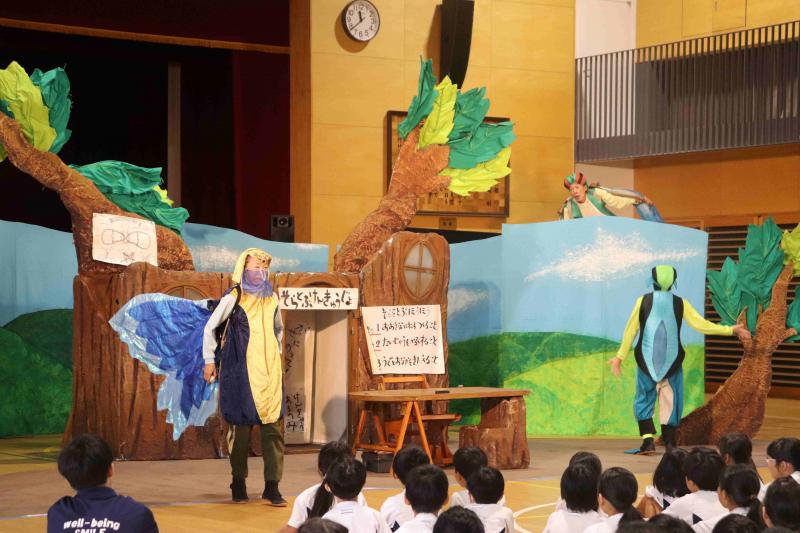 10月7日(火)、観劇会がありました。今年度は、劇団うりんこによる「かえるのそらとぶけんきゅうじょ」という劇です。