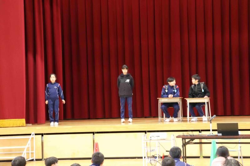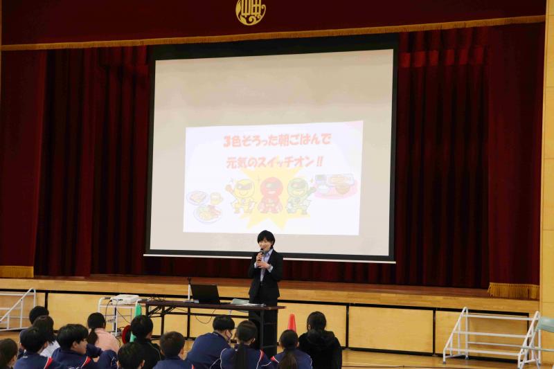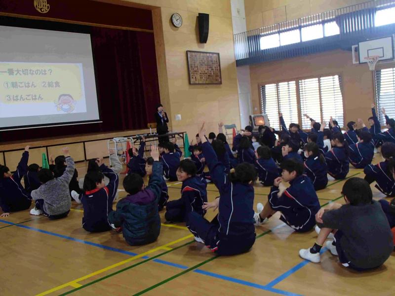 1月22日(木)、学校保健委員会がありました。「毎日朝ごはんを食べてスイッチオン」をテーマに、給食・保健委員会が劇と朝ごはんについてのアンケート結果を発表しました。栄養教諭の山本先生から、朝ごはんには体を働かせるスイッチがあること、朝ごはんをおいしく食べるには生活リズムが大切なこと、朝ごはんに食べると良い物などを教えていただきました。