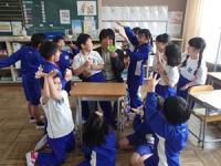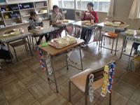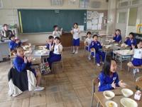 4月15日(水)の給食時の様子です。まだ、1年生は給食の提供がなく、11時30分頃に下校しています。2~6年生の各学級では、机を様々な隊形にして会食をしています。どの学級でも楽しくおしゃべりしながら会食しています。6年生は、ALTの先生を教室に招き、一緒に会食していました。