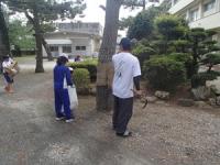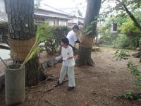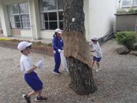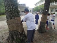昨年度の秋に3年生児童と保護者の方々、コミュニティ・スクール 関係者の方々で松の木に菰を蒔きました。撤去の時期は少し遅くなりましたが、4月28日(火)に、4年生児童が松の木に巻いてあった菰の撤去作業を行いました。作業前には、「なぜ、菰撒きをするのか」「なぜ、菰を取るのか」「泉小にとっての松の木の大切さ」などを確認し、作業に取り掛かりました。たまたま学校にお立ち寄りいただいた山内さんにもご協力いただき、児童と一緒に撤去作業を行いました。菰の中からは、ムカデやヤモリ、様々な昆虫などが出てきました。自然に触れながら、児童たちは協力して作業を行うことができ案した。
