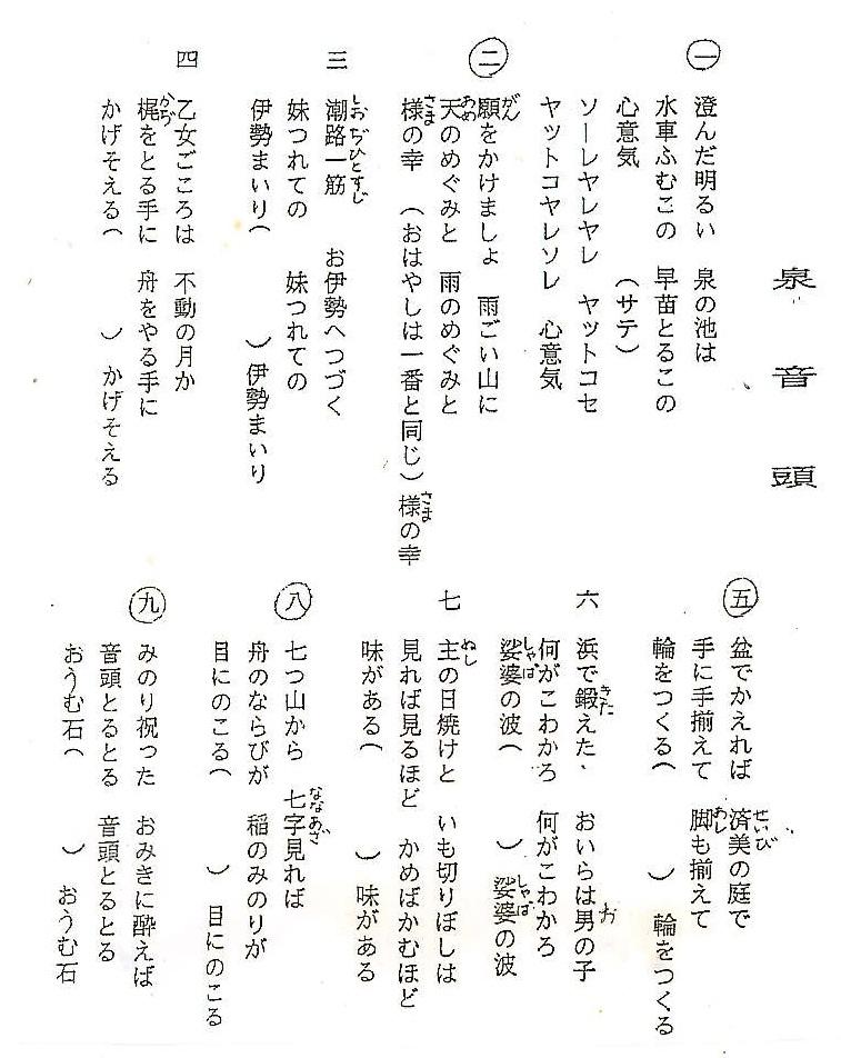 4月27日(月)に5・6年生児童が、運動会で演技する泉音頭の練習を行いました。地域の方にご来校いただき、踊りについてご説明いただいたり、ご指導をしていただいたりしました。歌詞には、「七ツ山」「泉が池」「鸚鵡石」などの泉校区の名称も登場します。また、かつて盛んであった生産物「芋切干」も登場します。今後、5・6年生児童は、泉音頭を下級生に教えたり、全校の中心となって泉音頭を踊ったりします。また、運動会だけではなく、夏の盆踊りにも積極的に参加し、泉音頭を踊り、児童たちが泉地区を盛り上げること、また、後世にもつないでくれることなどを期待しています。