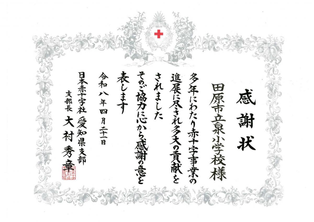 本校は、日本赤十字社の理念「気づき 考え 実行する」に賛同し、令和3年度より入会しており、本年度で6年目を迎えます。この度、日本赤十字社 愛知県支部より感謝状をいただき、4月28日(火)の朝会で、児童会会長が代表して表彰披露を行いました。また、表彰後の校長の話においても、「てるてる坊主」や「誕生日を祝う会」など日頃の児童たちの自主的、主体的な行動は日本赤十字社の理念とつながっていることを紹介しました。