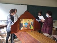 3月11日(水)の読み聞かせ終了後、まつぼっくりの会の方々は、紙芝居「流された永久丸」上演の練習を行いました。紙芝居、枠、拍子木を石川勝様より寄贈していただきました。今回の練習は、石川様からいただいた紙芝居を全校児童に披露するための練習です。当日は、手作りのお面もつけて上演してくださる予定です。