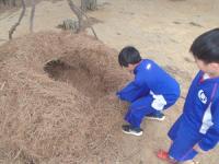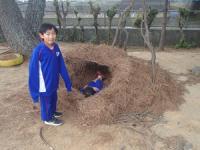 寒さがとても厳しい日が続いていますが、泉小の児童たちは2時間目の後、給食の後などの休み時間に、運動場に出て遊んでいます。サッカー、ドッジボール、長縄とびなどで遊んでいる児童もいますが、校庭西側にある赤土山で、自分たちで遊びを工夫して遊んでいる児童もいます。プラ段やデスクマット、段ボールなどを使って、そりをつくり、赤土山を滑って遊んでいる児童もいます、また、松葉、木の枝を集め、雪国のかまくらのような秘密基地を作って、中に入って「あったかーい」と言って寝ている児童もいます。自分たちで楽しく遊ぶ方法を考え、行動し、表現している姿に感心させられます。