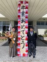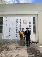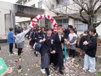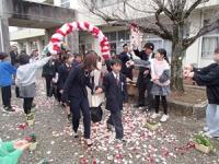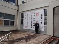 3月19日(木)の学級活動の後、6年生児童は保護者の方と一緒に、3・4・5年生児童や教育委員会の方、保護者の方、教職員などが卒業生の見送りのためにつくった花道を通り、去校しました。花道を通る際には、参列者が卒業生の卒業を祝福するために花びらを撒き、フラワーシャワーを行いました。卒業生にも保護者にも笑顔がいっぱいでした。また、見送り後は、「卒業おめでとう」看板、入場門、大型卒業証書などで、保護者による記念撮影を行っていました。