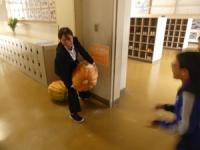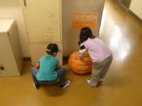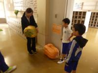 10月21日(火)に、地域の方からいただいたジャンボかぼちゃ2個を展示しました。1つは約13㎏、もう1つは約35㎏です。児童や教職員は、見たり、触ったり、少し持ち上げてみたりなど興味津々でした。