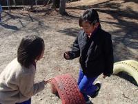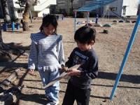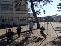 2月3日(火)の昼の休み時間は、15分間です。たくさんの児童が外に出て、鬼ごっこで校地内を走り回ったり、ブランコに乗ったり、遊具で遊んだり、木の枝や落ち葉を使って遊んだりしています。休み時間は、校庭に楽しそうな声や笑い声などが響いています。