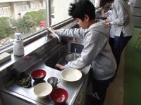 2月17日(火)に、5年生は、みそ汁づくりの調理実習を行いました。今回の調理実習は、そろぞれの活動を保証するために、グループの活動ではなく、ペアの活動で行いました。様々な味噌について学び、具材もペアで相談して決め、2人で作業を分担して調理を行いました。完成したみそ汁を「おいしい」と言って食べていました。