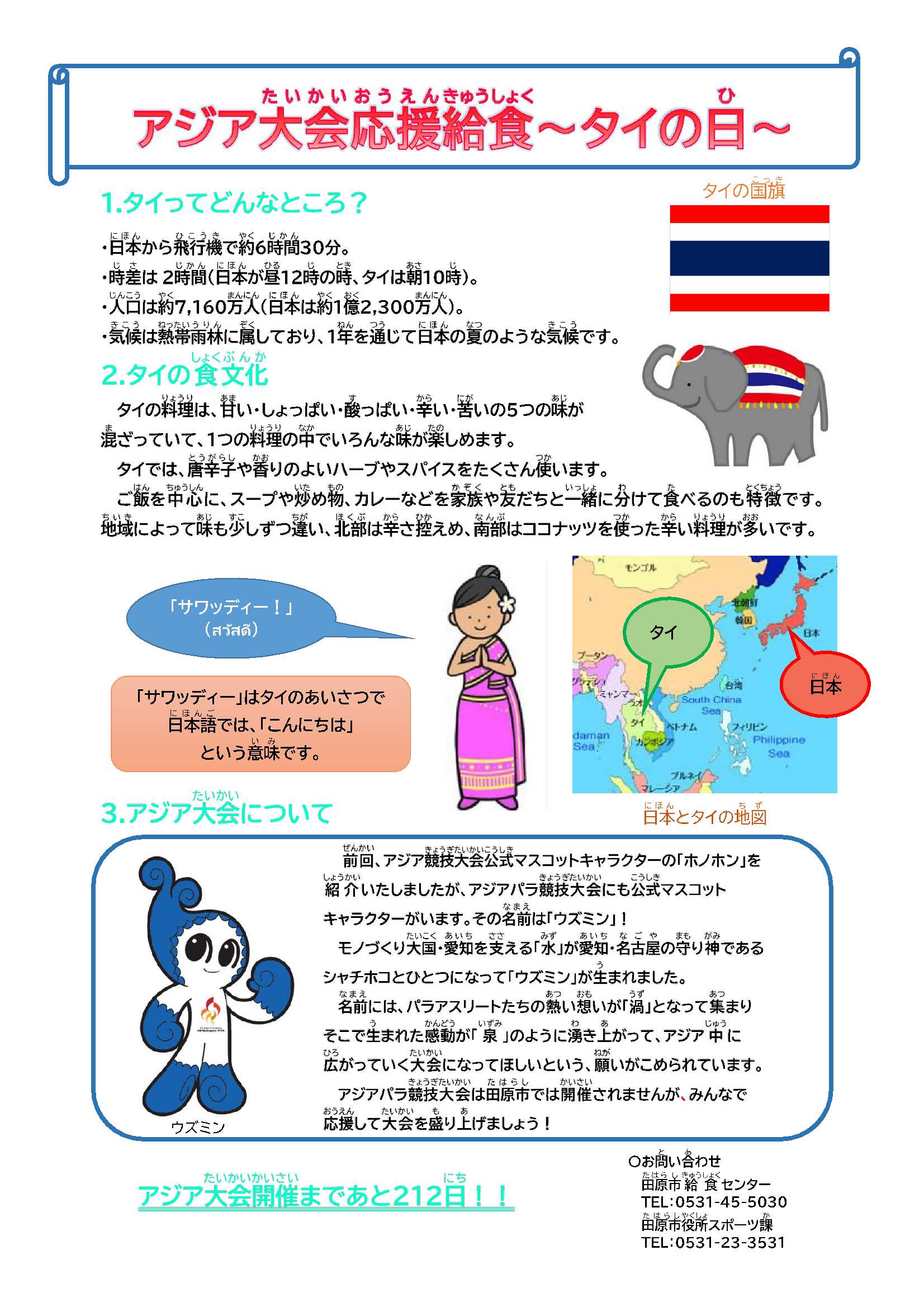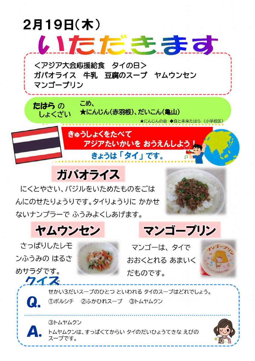 2月19日(木)の給食は、アジア大会応援給食 タイの日として、ガパオライス、ヤムウンセン、マンゴープリンなどが提供されました。ガパオライスとは、香ばしく炒めたひき肉に赤パプリカやホーリーバジル(=ガパオ)を加え、ナンプラーや砂糖で味付けしたものをご飯の上にのせた料理です。ヤムウンセンは、タイの伝統的な春雨サラダで、「ヤム」は「和える」、「ナンセン」は「春雨」という意味です。味付けにナンプラーとレモンを使い、甘酸っぱい風味のサラダに仕上げてあります。また、タイでは、いろいろな種類のマンゴーを生産しています。児童たちからは「初めて食べる」「ガパオライスがおいしい」「マンゴープリン最高」「ヤムウンセン、おかわりしました」などの感想がたくさんありました。