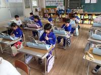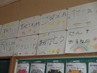 1年生の教室には、1年生児童が最近t取り組んだ掲示物が、教室背面に掲示されています。「キラキラ☆発表会」で一人一枚発表した「ふわふわ言葉」、「節分集会」で、「自分の中から出て行ってほしい鬼」などの掲示物があります。人にやさしく、自分の目標に向かって成長していってほしい願いが込められた掲示物です。そんな教室環境の中、1年生児童は学習に取り組み、人と関り、学校生活を送っています。