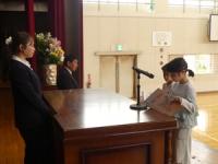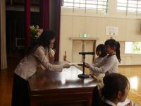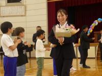 4月14日(火)に、退任式を行いました。令和8年度に異動した職員を迎え、児童たちが、今までお世話になった教職員に感謝の気持ちを表したり、これからの学校生活を新たな気持ちで前向きに取り組んでいこうという意欲を高めるために行いました。式では、各学年の代表児童が、転任教職員にメッセージや感謝の言葉を伝え、花束を贈りました。また、転任者からのお別れの話を聞き、涙を流す児童もいました。