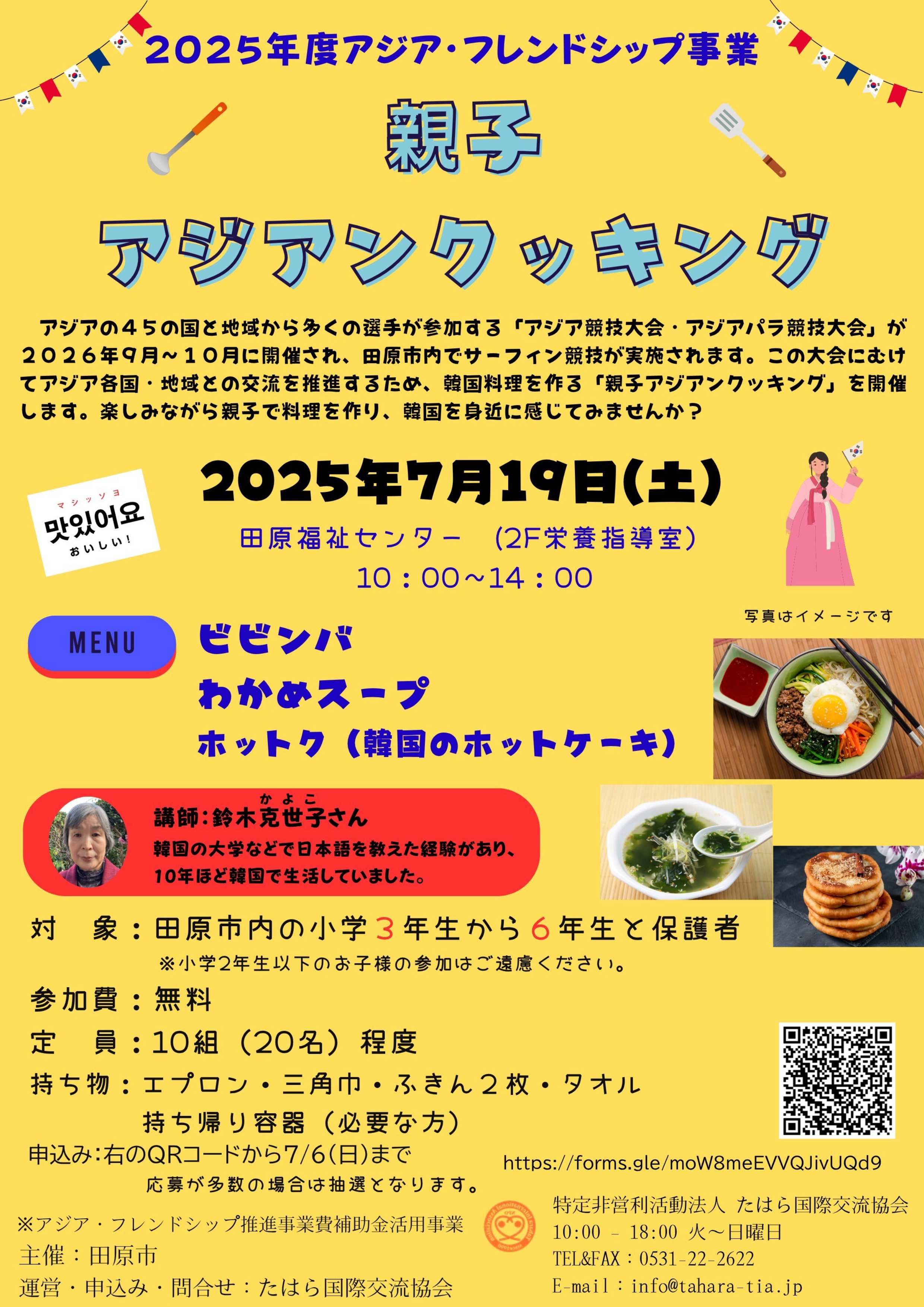 田原氏が主催する「親子アジアンクッキング」のチラシです。田原福祉センターにて7月19日(土)に開催されます。 |