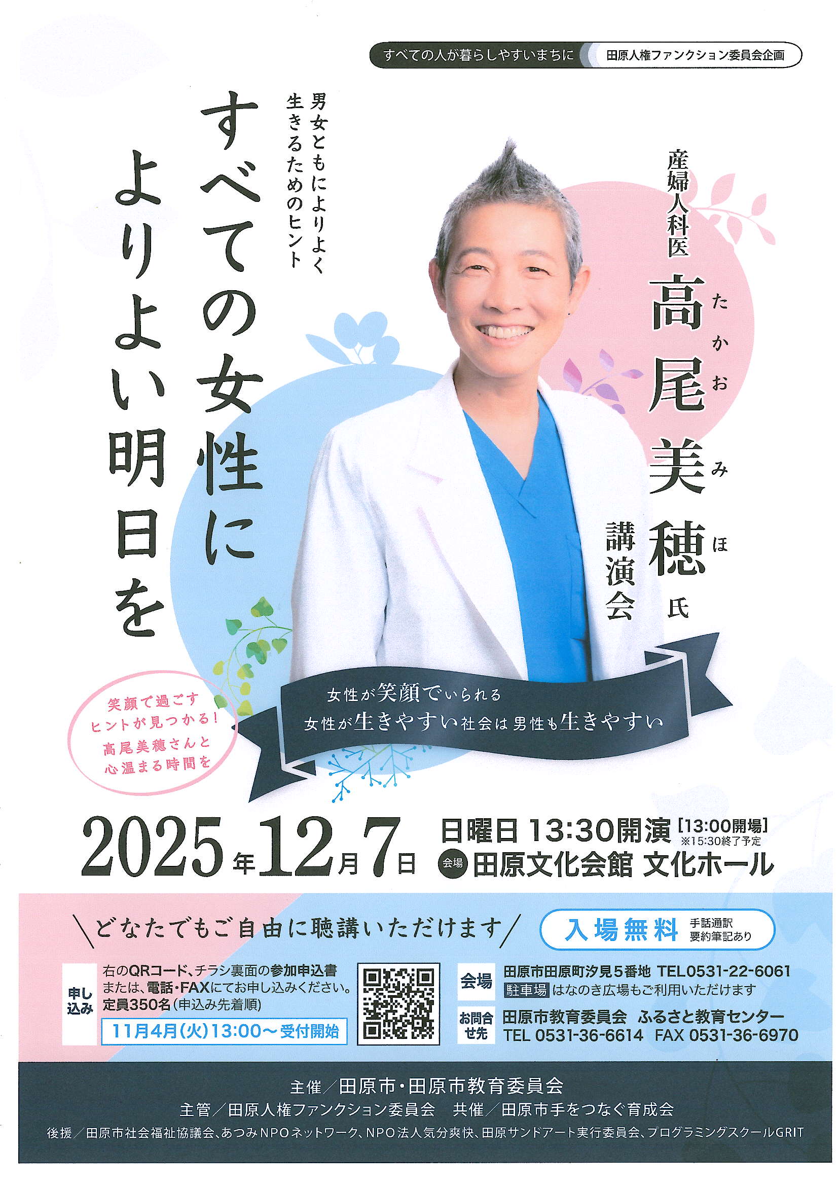 田原市教育委員会が主催する「人権ファンクション委員会講演会」のチラシです。令和7年12月7日(日)に田原文化会館にて開催されます。 |