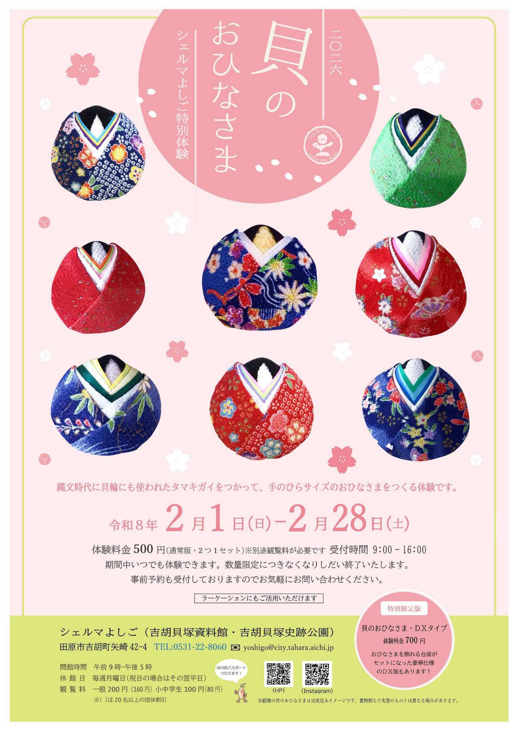 シェルマよしごが主催する「貝おひなさま」のチラシです。2月1日(日)から2月28日(土)にシェルマよしごにて開催されます。