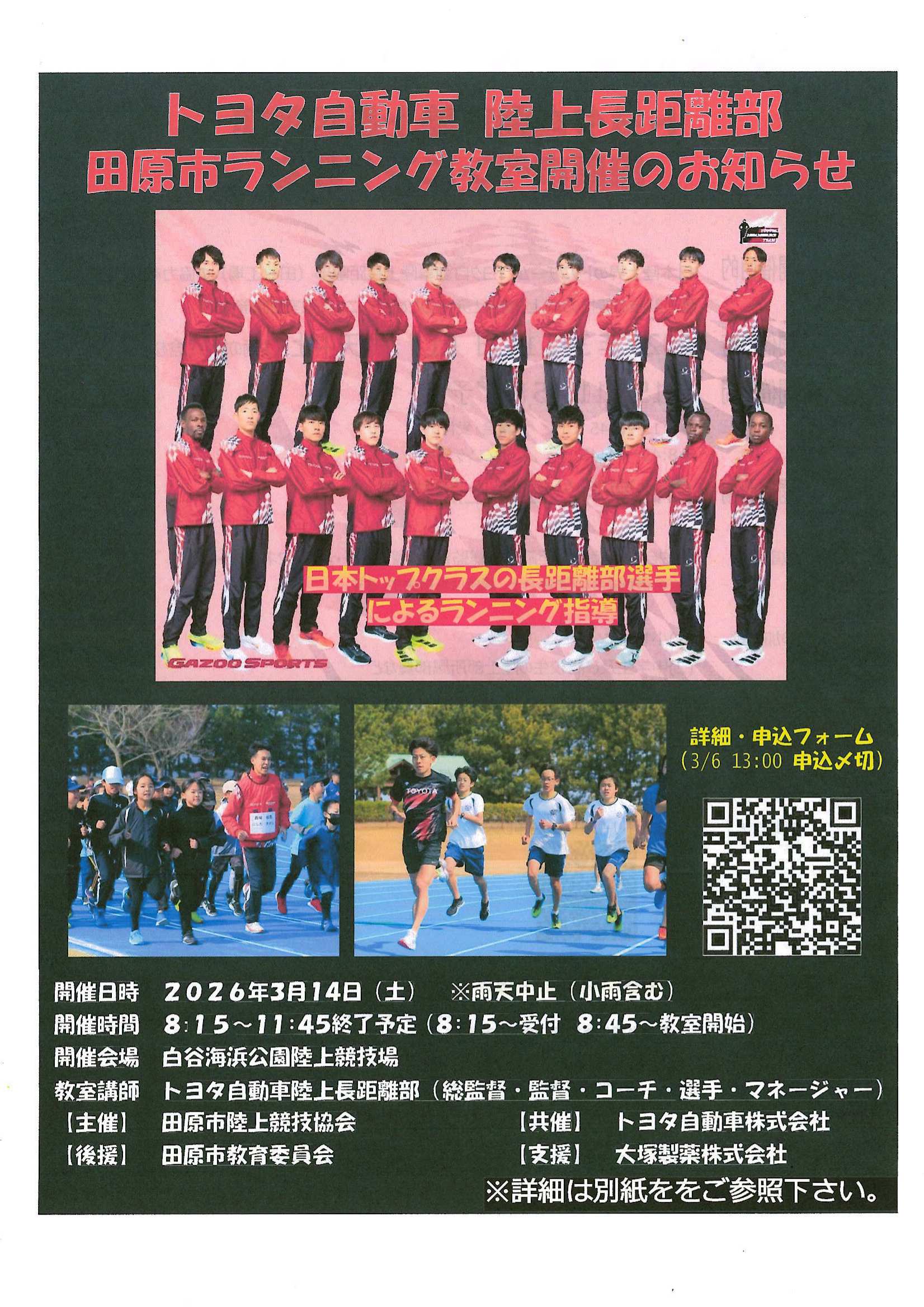 田原市陸上競技協会が主催する「トヨタ自動車 陸上教室」のチラシです。3月14日(土)に白谷海浜公園陸上競技場にて開催されます。 |