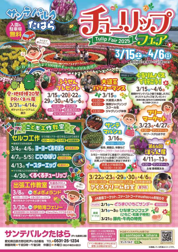 サンテパルクたはらで開催される、チューリップフェアのチラシです。開催日は3月15日(土)から4月6日(日)です。 |