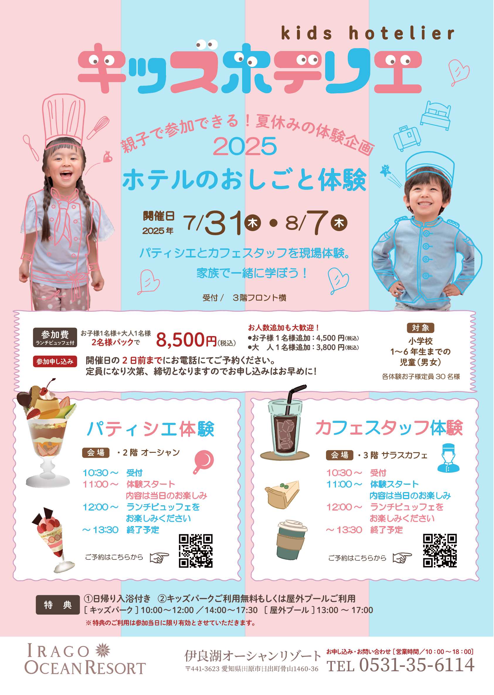 伊良湖オーシャンリゾートが主催する「キッズホテリエ」のチラシです。伊良湖オーシャンリゾートにてにて7月31日(木)、8月7日(木)に開催されます。 |