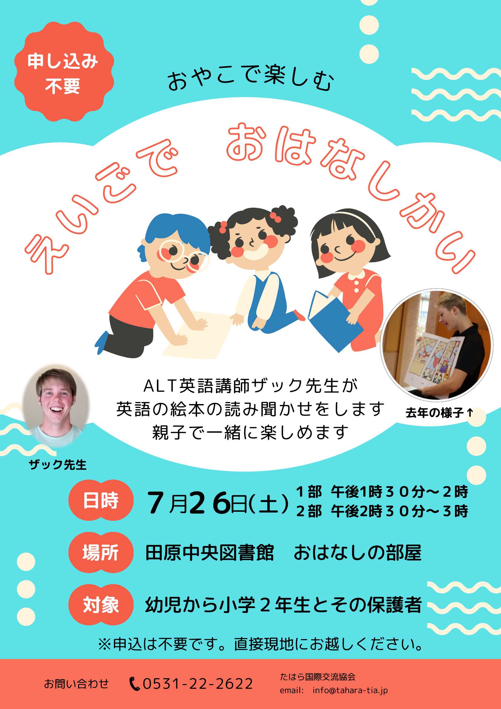 田原国際交流会が主催する「ザック先生の絵本の読み聞かせ会」のチラシです。田原中央図書館にて7月26日(土)に開催されます。 |