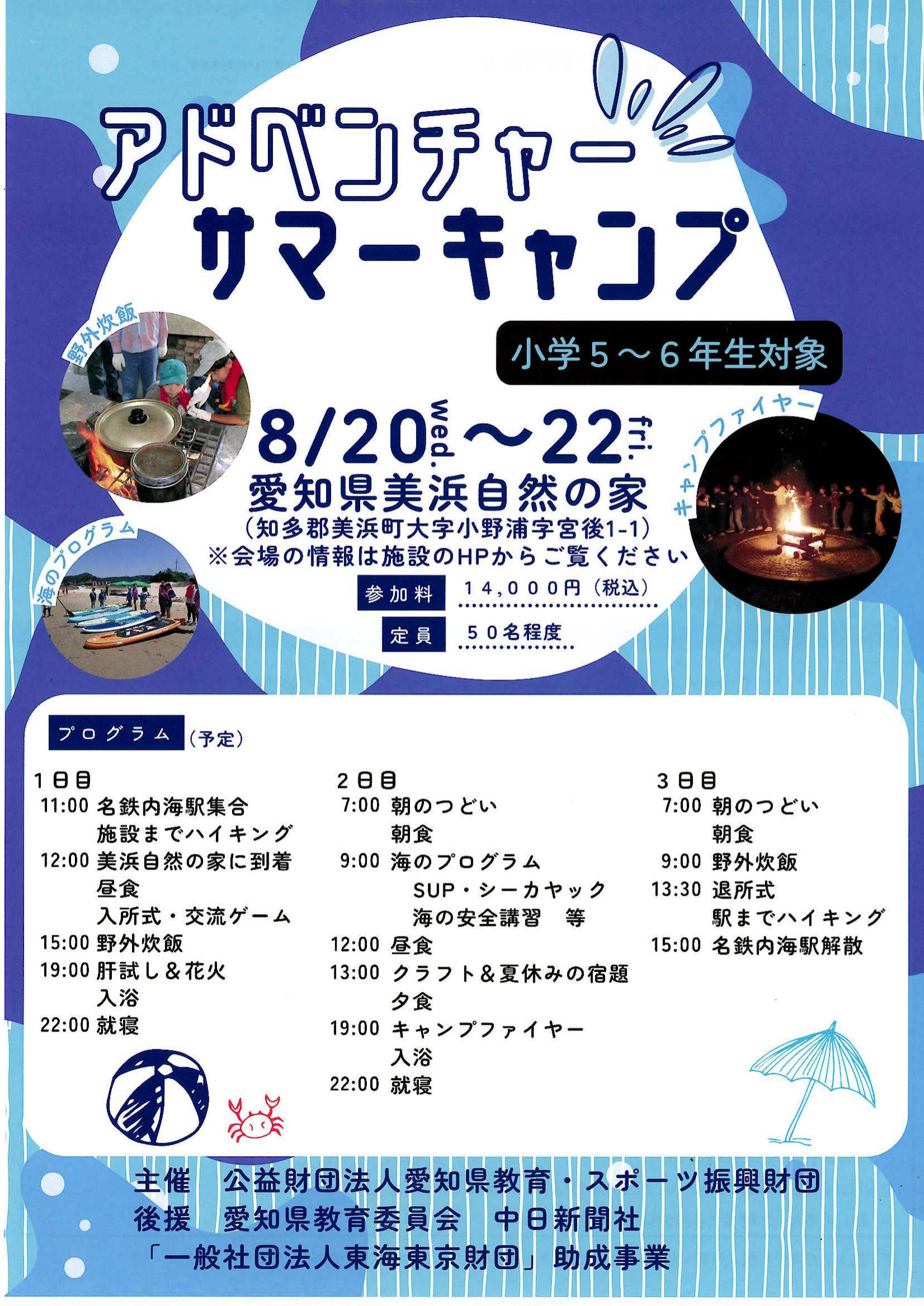 愛知県教育・スポーツ振興財団が主催する「アドベンチャー サマーキャンプ」のチラシです。愛知県美浜自然の家にて8月20日(水)から22日(金)に実施されます。 |