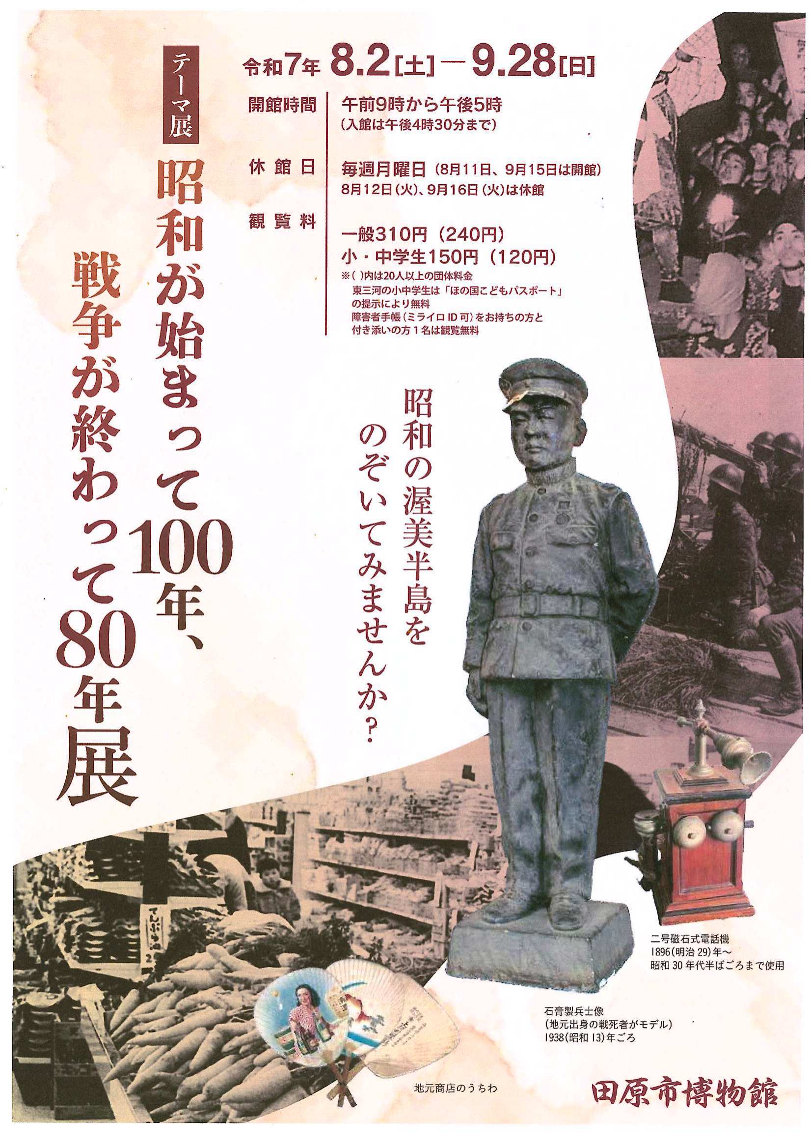 田原市博物館が主催する「昭和が始まって100年、戦争が終わって80年展」のチラシです。8月2日(土)から9月28日(日)に開催されます。 |