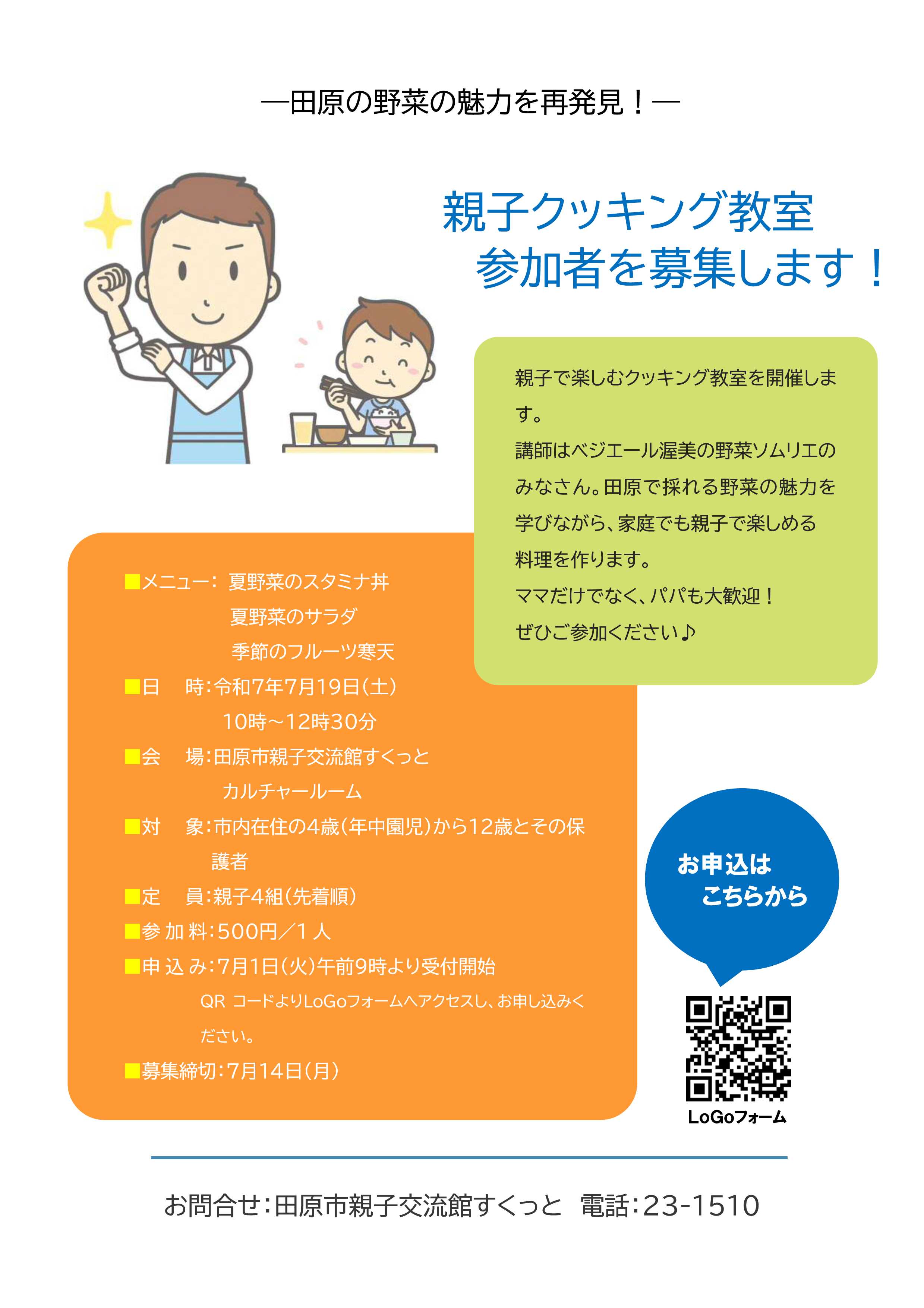 田原市親子交流館すくっとが主催する「親子クッキング教室」のチラシです。すくっとにて7月19日(土)に開催されます。 |