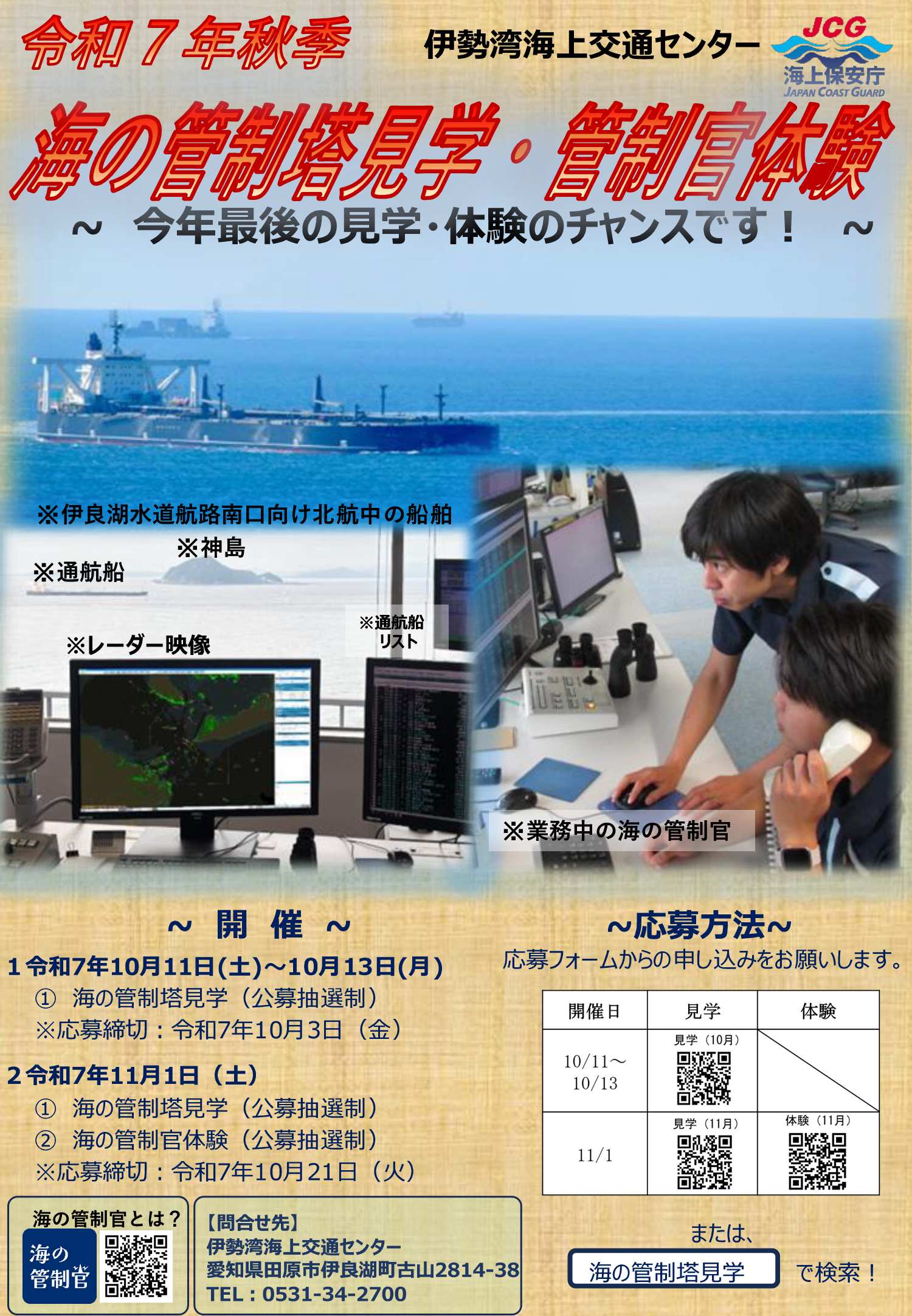 伊勢湾海上交通センターが主催する「伊勢湾海上交通センター見学・体験」のチラシです。10月11日(土)から10月13日(月)に開催されます。