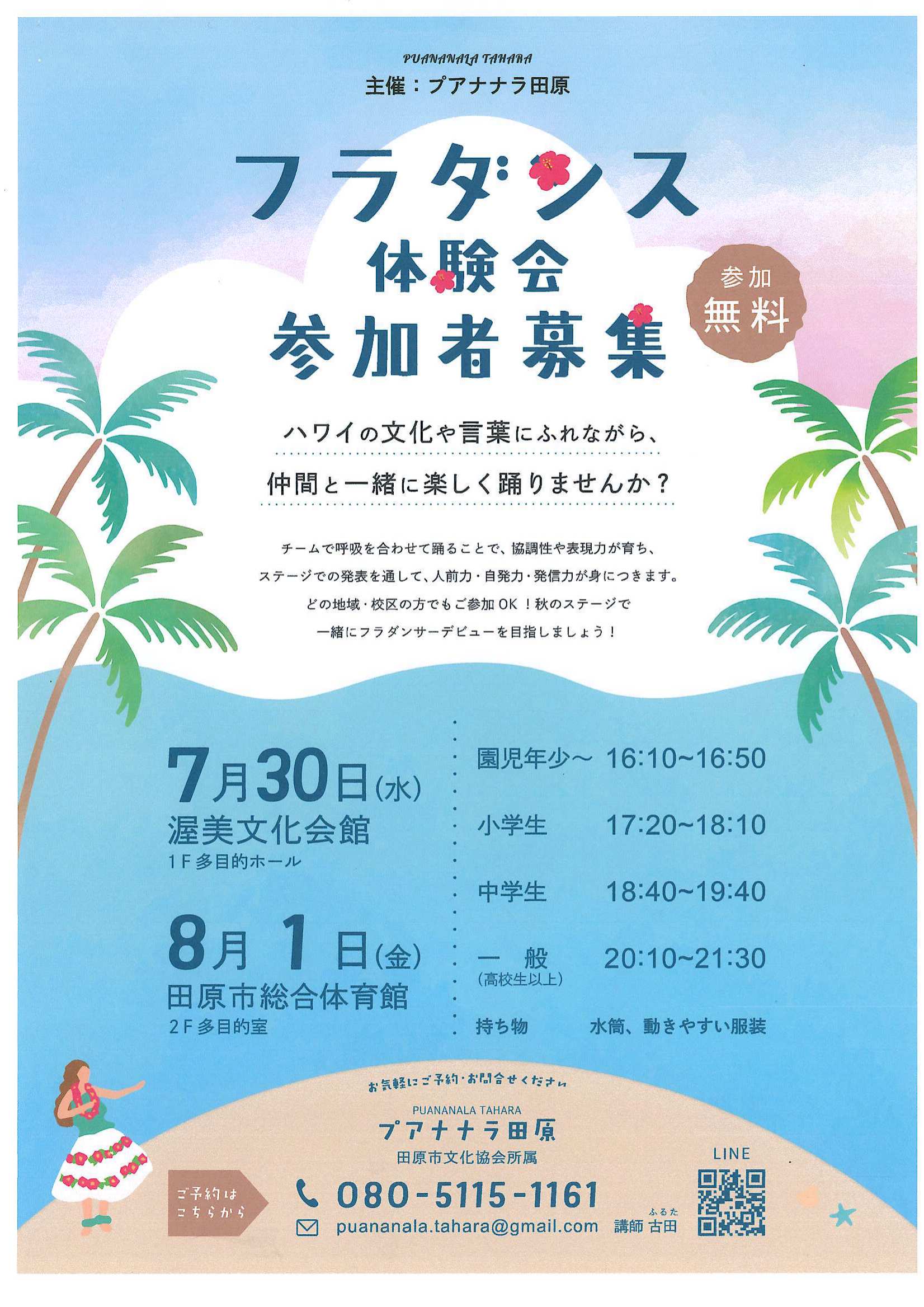 プアナナラ田原が主催する「フラダンス体験会」のチラシです。7月30日(水)に渥美文化会館、8月1日(金)に田原市総合体育館にて開催されます。 |