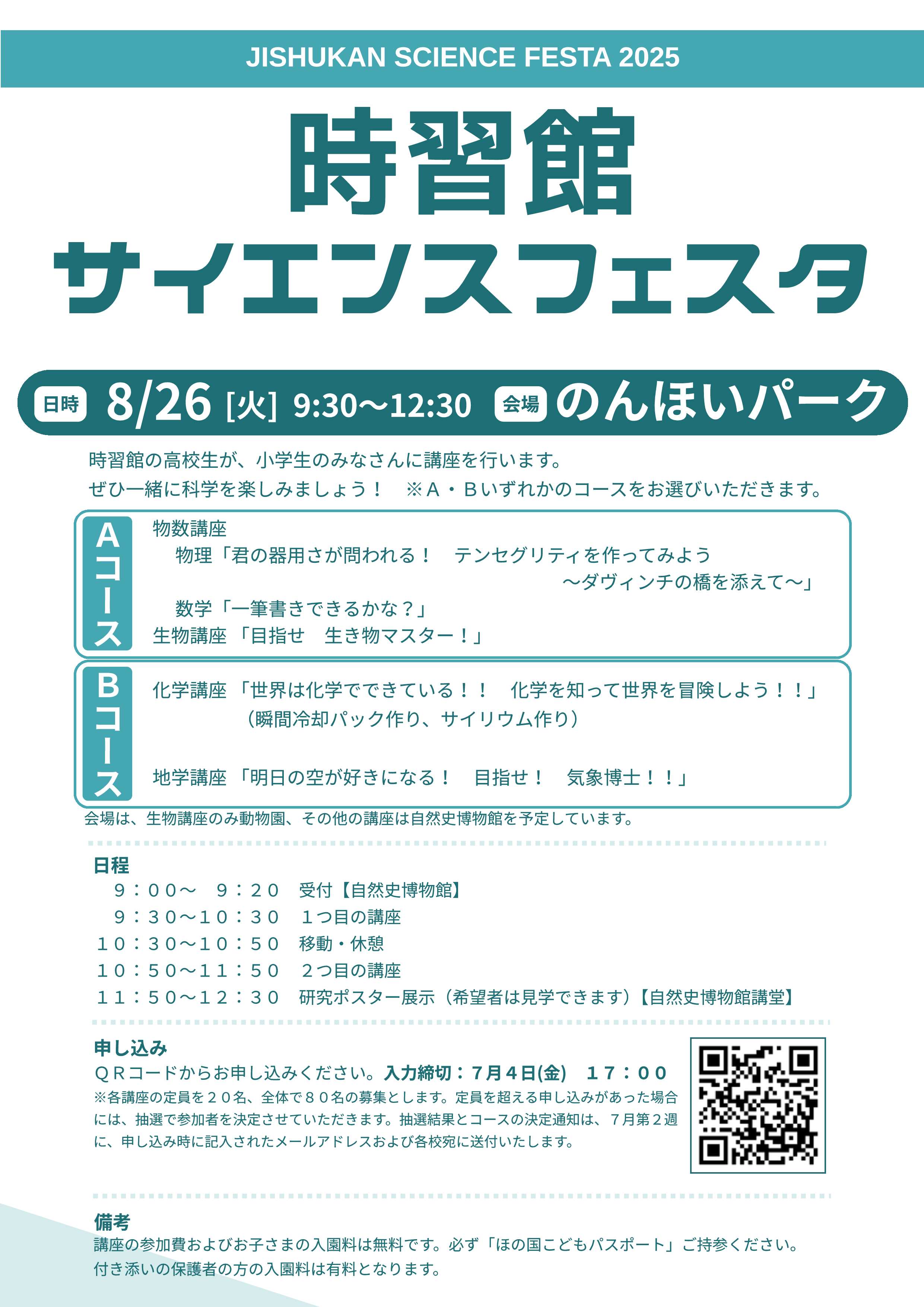 時習館高校が主催する「時習館サイエンスフェスタ」のチラシです。のんほいパークにて8月26日(火)に開催されます。 |
