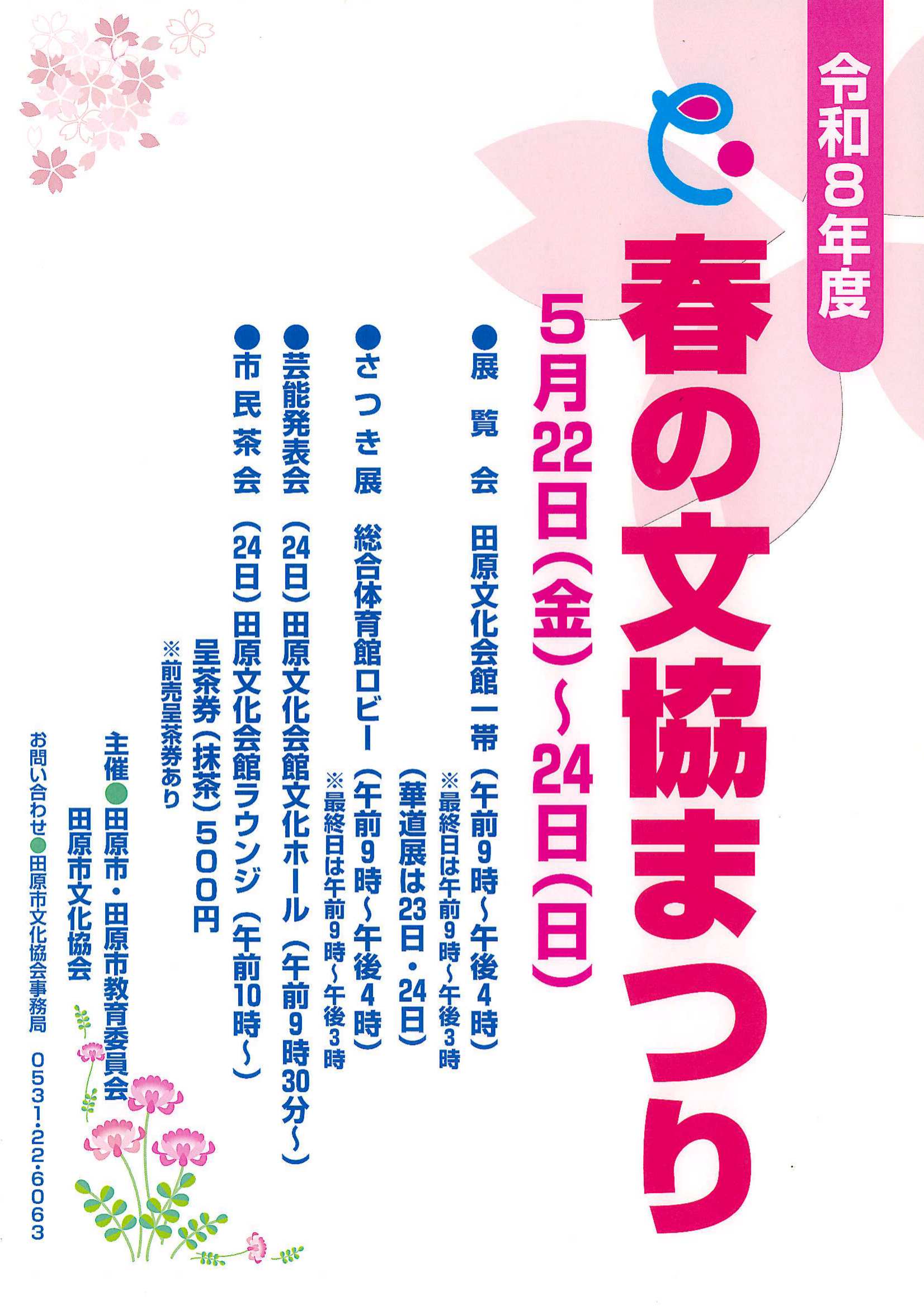田原市教育委員会、田原市文化協会が主催する「春の文協まつり」のチラシです。5月22日(金)から24日(日)に、各会場にて開催されます。 |