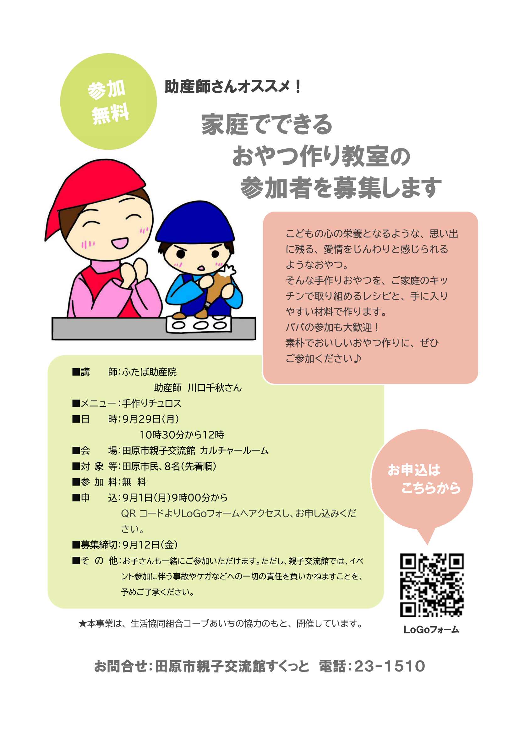 田原市親子交流館すくっとが主催する「家庭でできるおやつ作り教室」のチラシです。9月29日(月)に開催されます。 |