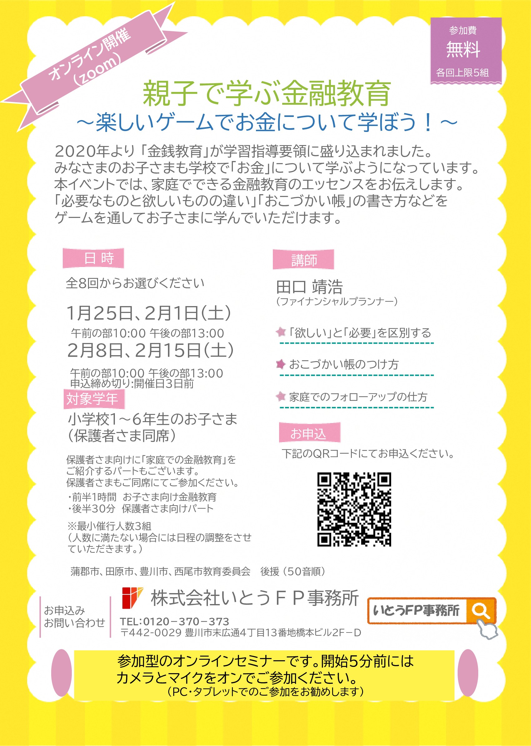 お金について、親子で一緒に学びましょう。Zoomを利用したオンライン開催です。 |