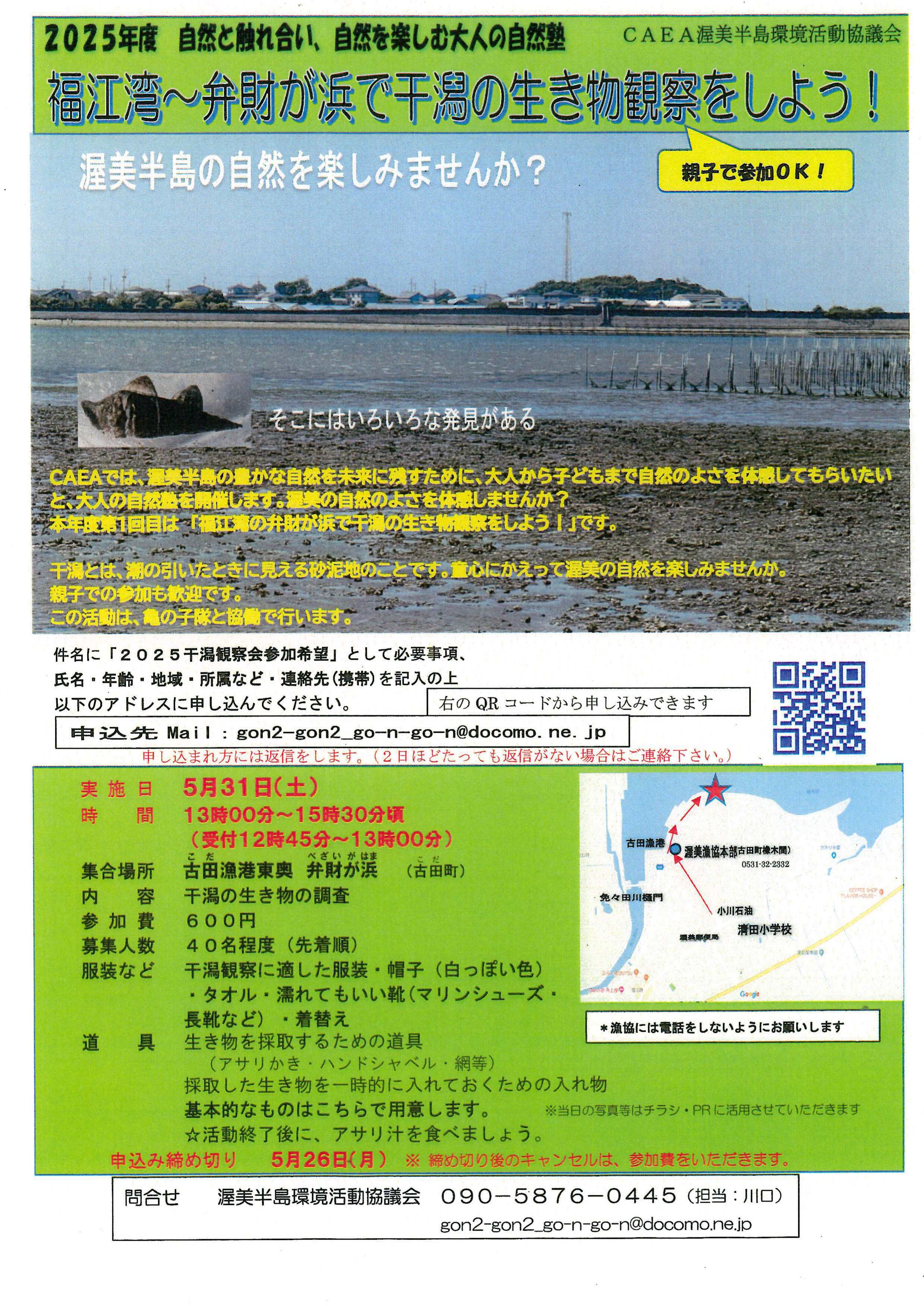 渥美半島環境活動協議会が主催する自然体験活動のチラシです。弁財が浜にて5月31日(土)に開催されます。 |