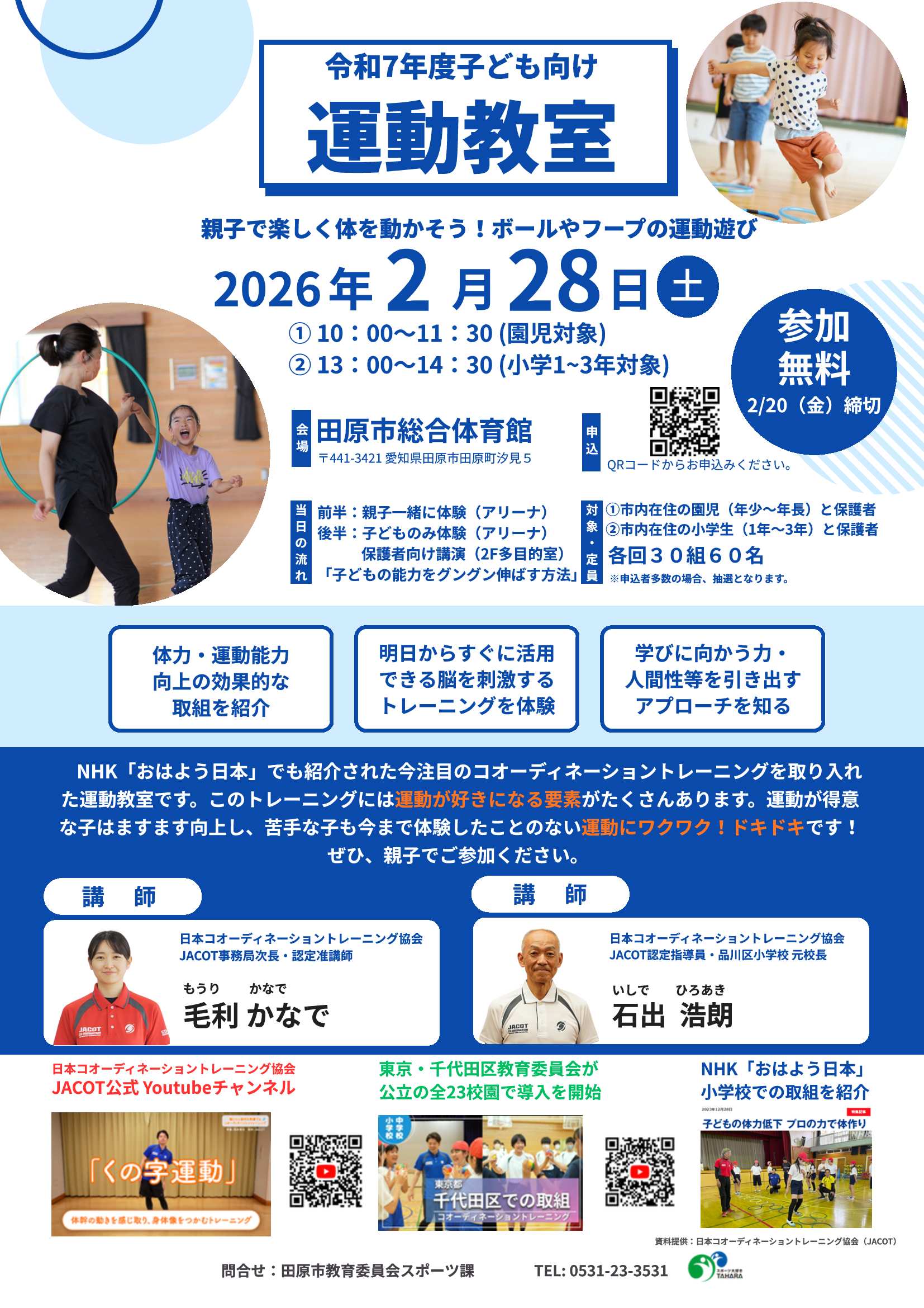 田原市教育委員会が主催する「子ども向け運動教室」のチラシです。2月28日(土)に田原市総合体育館にて開催されます。 |