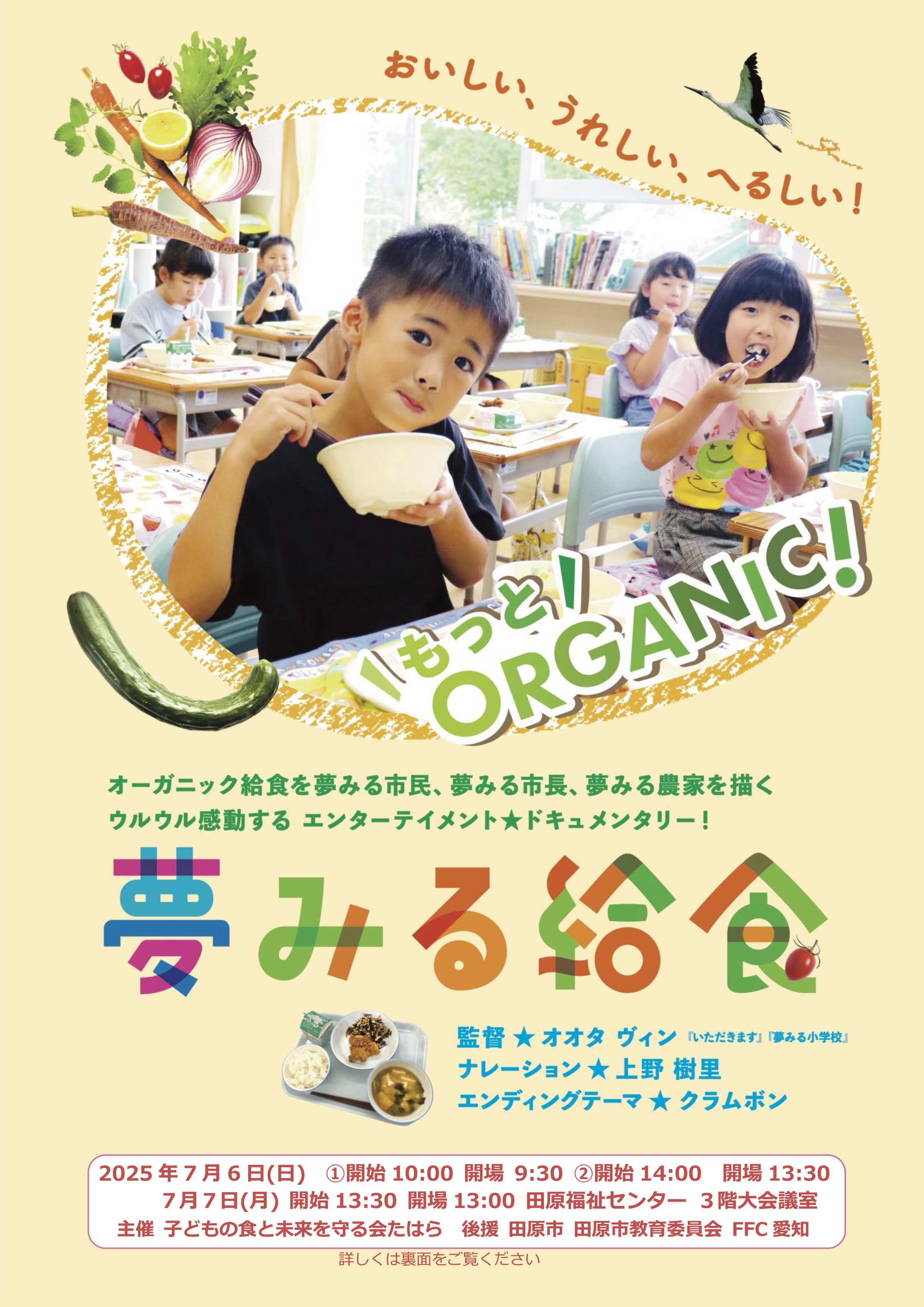 ドキュメンタリー映画「夢見る給食」上映会のチラシです。田原福祉センターにて7月6日(日)、7日(月)に上映されます。 |
