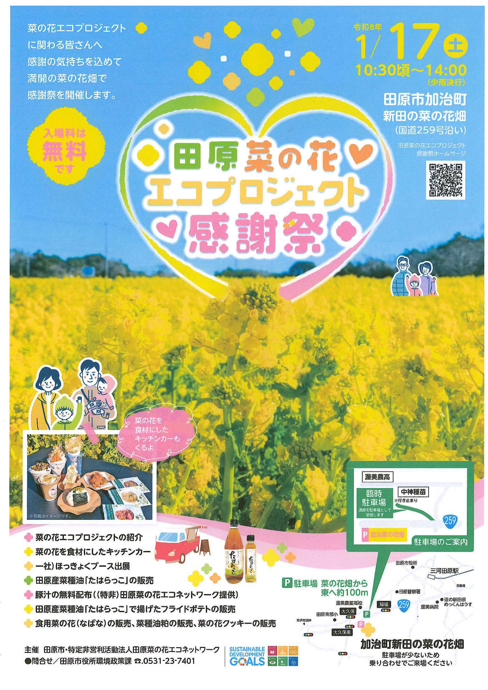 田原市・特定非営利活動法人田原菜の花エコネットワークが主催する「田原菜の花感謝祭」のチラシです。1月17日(土)に加治町新田の菜の花畑にて開催されます。 |