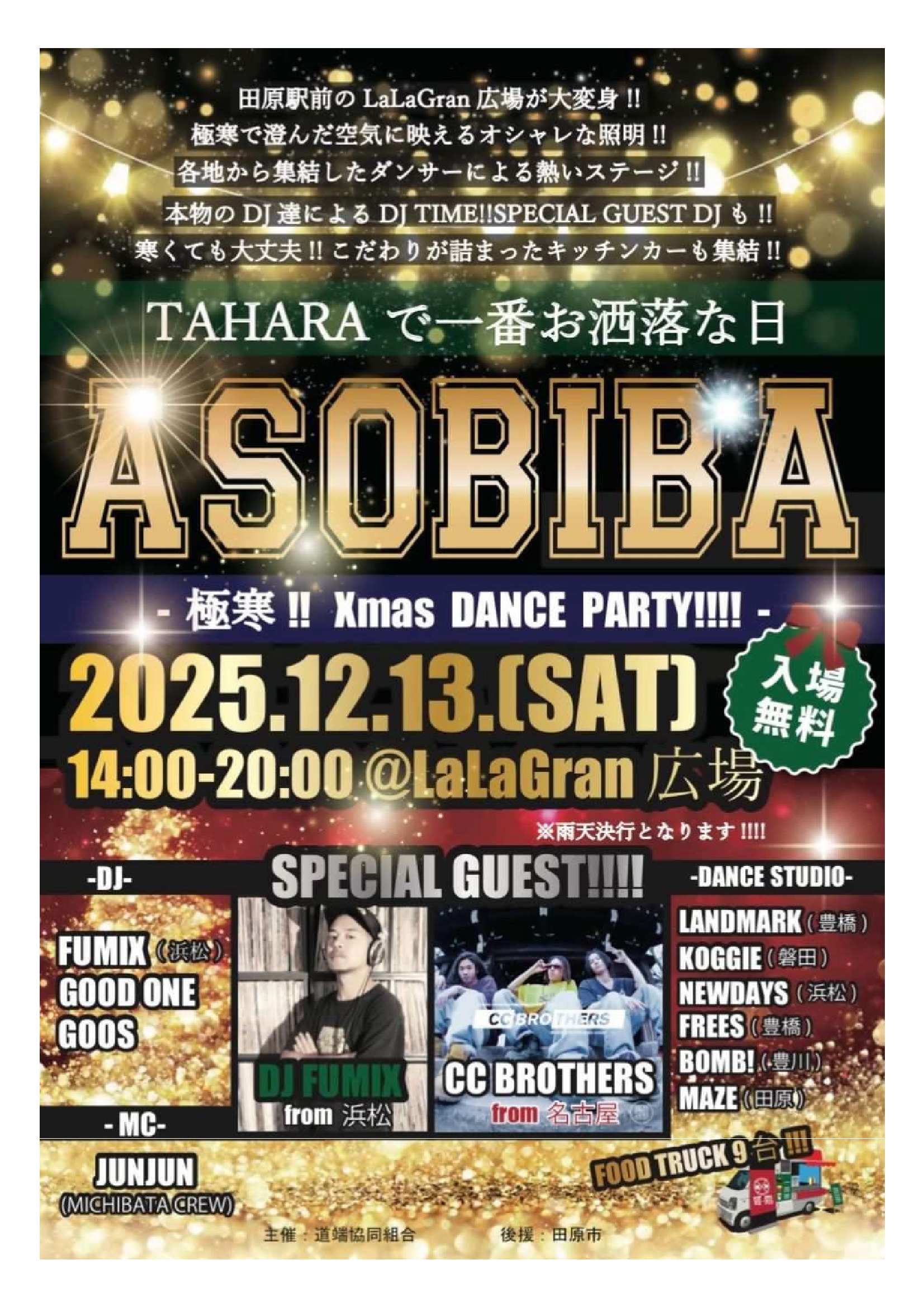 道端共同組合が主催する「ASOBIBA」のチラシです。12月13日(土)にLaLaGran広場にて開催されます。 |