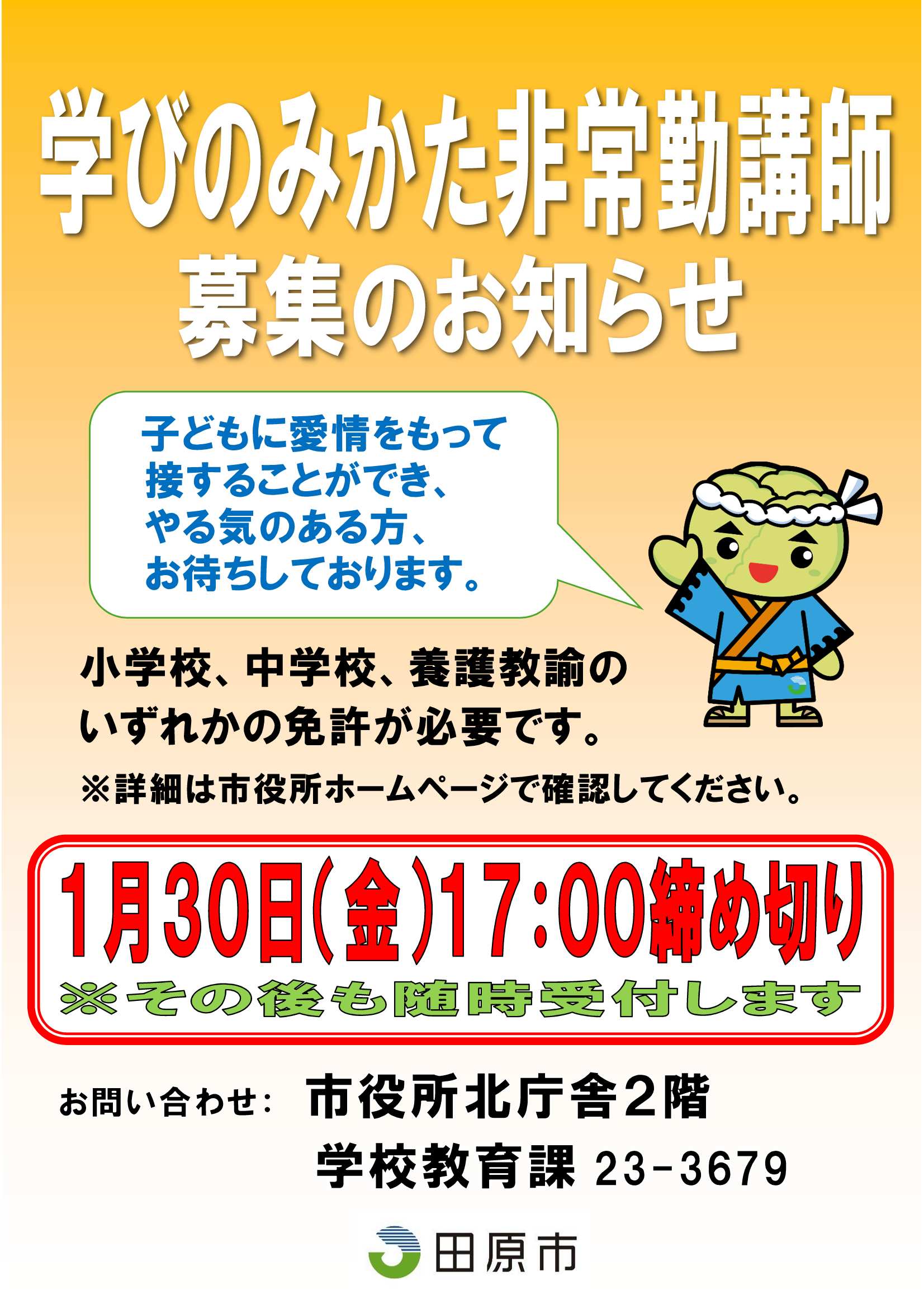 田原市教育委員会では「学びのみかた非常勤講師」を募集しています。1月30日(金)受付締め切りです。詳しくは田原市役所ホームページをご覧ください。 |